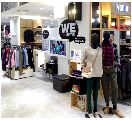 La sofisticada combinación de colores blanco y negro en la recien inaugurada tienda se destacan y de acuerdo con Young Plaza, el diseño de armarios con un tono marrón aumenta la sensación de lujo. Tambien se instaló una TV delante de la tienda que cuenta con imágenes de vídeos de JYJ (los modelos exclusivos), que capturan los ojos de los consumidores.
